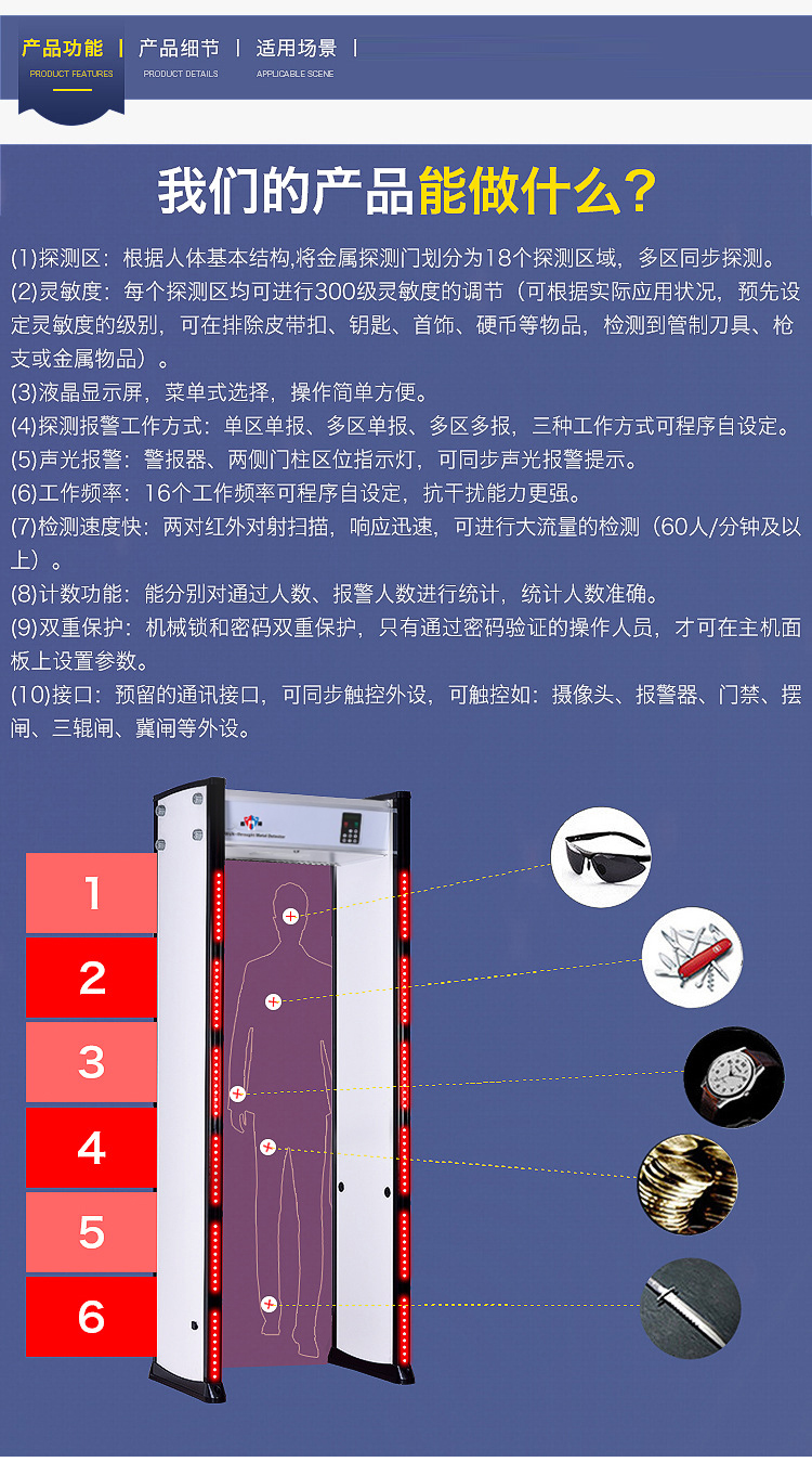 看門神 KMS-600K安檢門(18區(qū))采用電磁兼容設計和抗震動設計,具有高靈敏度、強抗干擾能力和強抗震能力,適用于管制刀具和槍支等危險物品的安全檢查,廣泛應用于監(jiān)獄、法院、學校、醫(yī)院、電子企業(yè)、港口、客運站、展覽會館、會議中心、重大慶典、演唱會等重要場所。