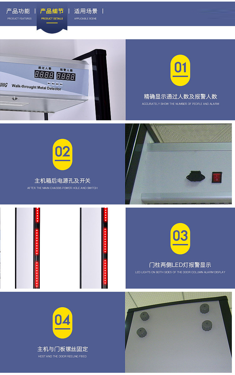 看門神 KMS-600G安檢門(6區)采用電磁兼容設計和抗震動設計,具有高靈敏度、強抗干擾能力和強抗震能力,適用于管制刀具和槍支等危險物品的安全檢查,廣泛應用于監獄、法院、學校、醫院、電子企業、港口、客運站、展覽會館、會議中心、重大慶典、演唱會等重要場所。