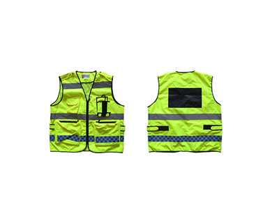 背心為前開襟馬甲式樣,開襟用拉鏈拉合,左右胸前分別縫制一個固定和可調節深度的兩個口袋及警徽、警號毛刺貼,腰部通過錦絲毛刺搭粘調節胖瘦。