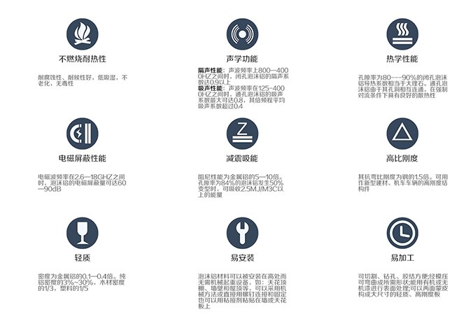 防彈泡沫氈(金屬防彈泡沫板)具有較高比剛度和比強度等優良的力學性能,同時具有相對密度低、孔隙率高、比表面積大以及較好的吸聲、隔音、隔熱、散熱、阻燃、減振、阻尼、抗沖擊、電磁波屏蔽等多種物理性能。