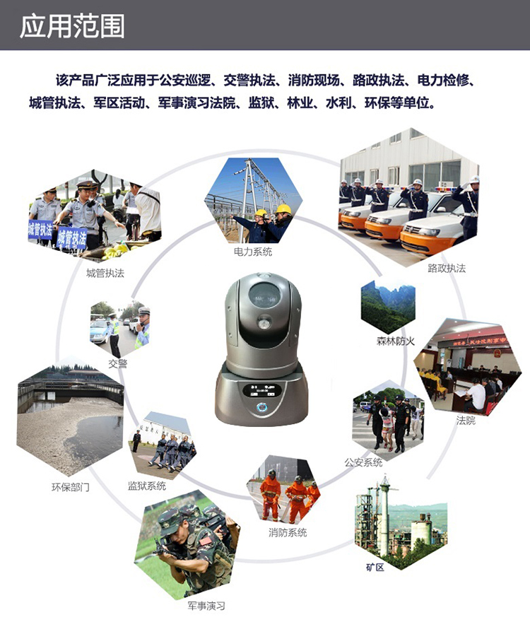 執行任務時可快速將設備臨時安放在需要監控的位置或直接吸附在車輛上,任務結束時可方便將設備拆下,適用于外勤執法、偵查布控、安防安保、應急指揮、搶險搶修、巡線管理等行業應用,比如公安、交警、消防、路政、城管、交通、法院、監獄、林業、電力、水利、環保等單位。